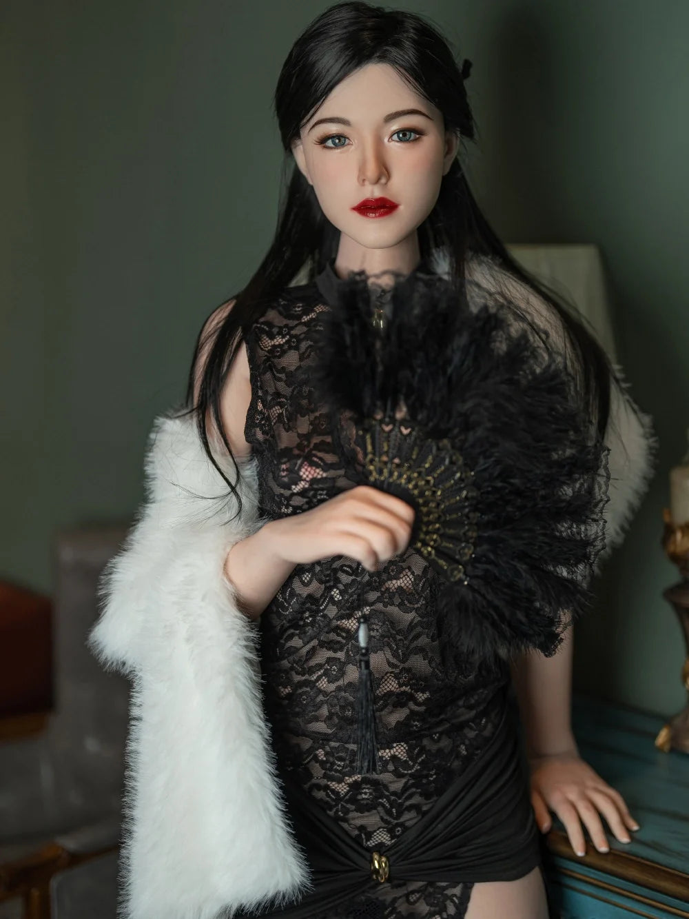 F7516 has smooth long straight black hair, with curved willow-leaf eyebrows, charming almond eyes and delicate red lips. She wears a sexy black lace cheongsam and holds an exquisite fan, just like an oriental beauty from a classical painting. Every detail of her exudes a strong Chinese style, especially suitable for you who love oriental charm.