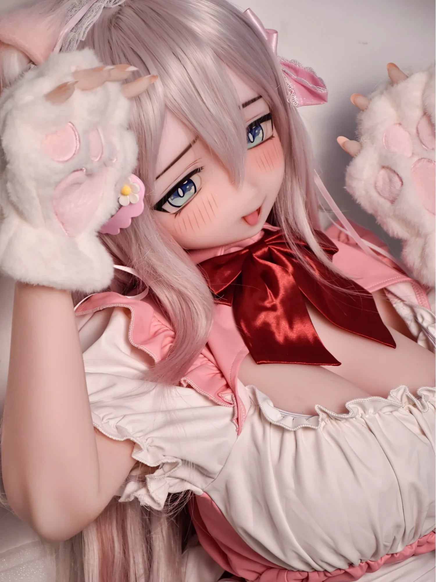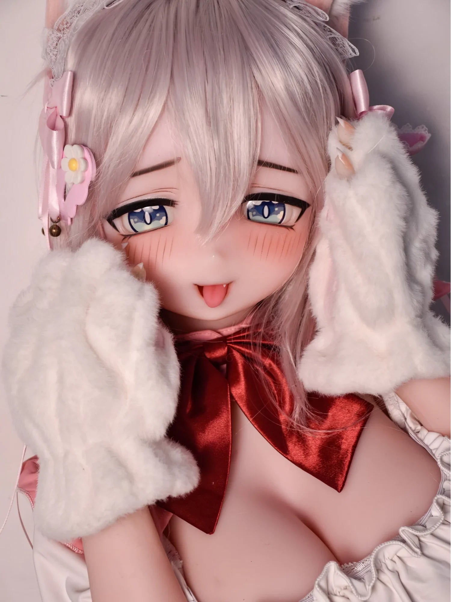 She wears a pair of furry cat ears, tiny gloves, and an exquisite lolita dress. Her large, sparkling eyes, a cute little nose, and a slightly open mouth playfully poking out her pink tongue. Her frowning expression makes her look like a wronged yet adorable cat, making you want to hug her and comfort her.