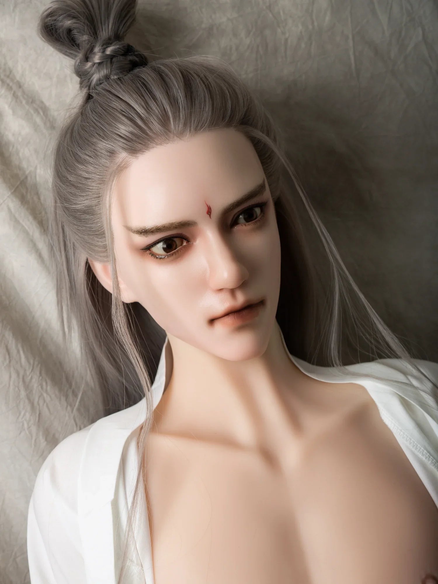 This male doll combines the design of silicone head and TPE body, which perfectly shows the charm of the ancient style beautiful man. Dressed in ancient Chinese style clothes with long silver hair, he gives a unique sense of nobility and beauty of ancient charm. The delicate face of the silicone head makes his features more three-dimensional and realistic, as if you can feel his emotions and mysterious aura when gazing at him, while the TPE body provides a soft skin touch that is no different from real skin, especially when interacting with it, and the muscle lines and feel of the body are to die for.