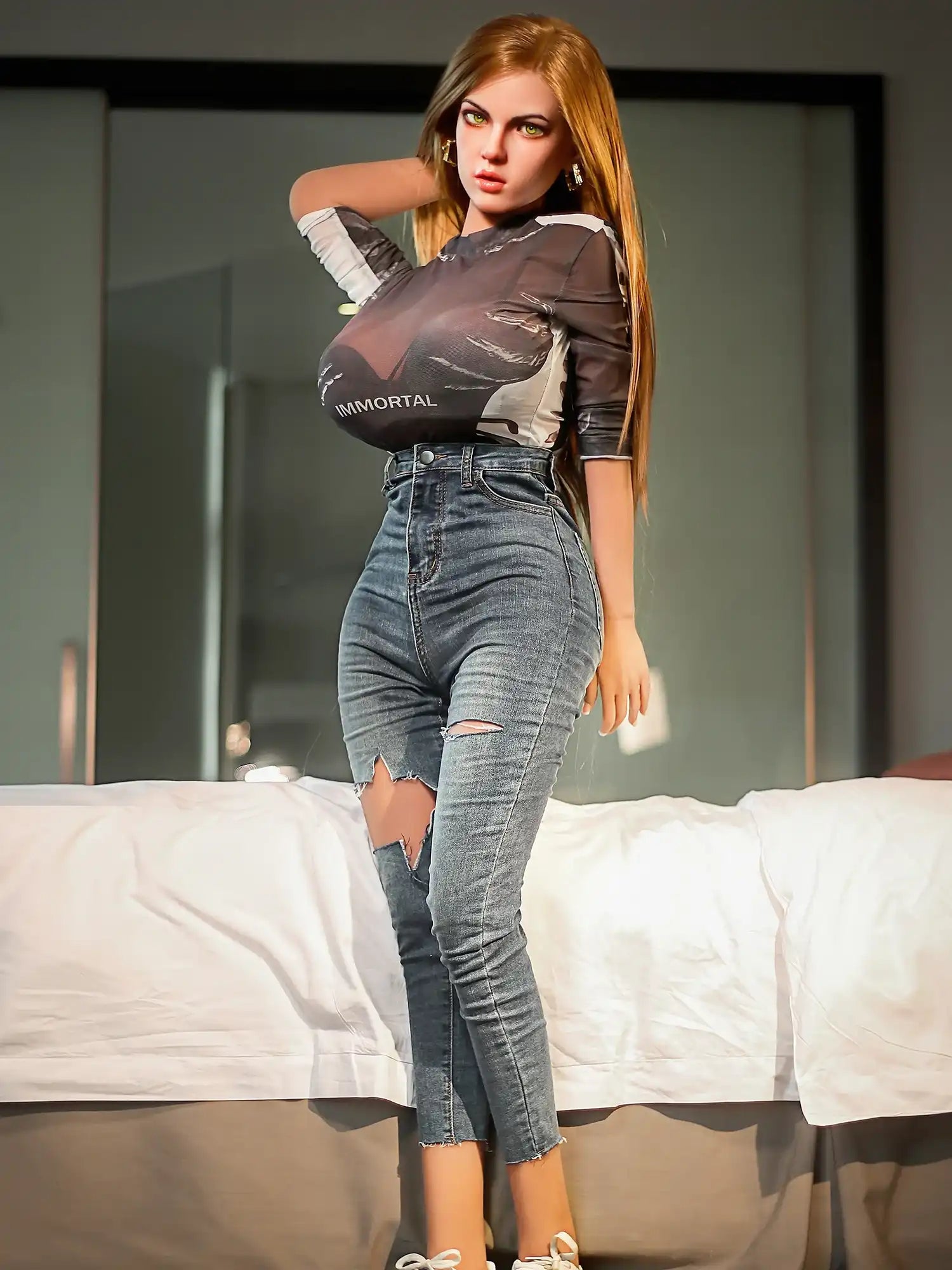 This blonde BBW Sex Doll, with a shocking 87 cm super bust, is paired with a sexy tight top and charming eyes, which is soul-stirring. The soft TPE material restores the real touch, and every grasp makes people's heart beat faster, and they can't extricate themselves from it.
