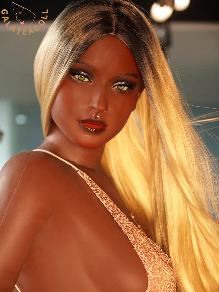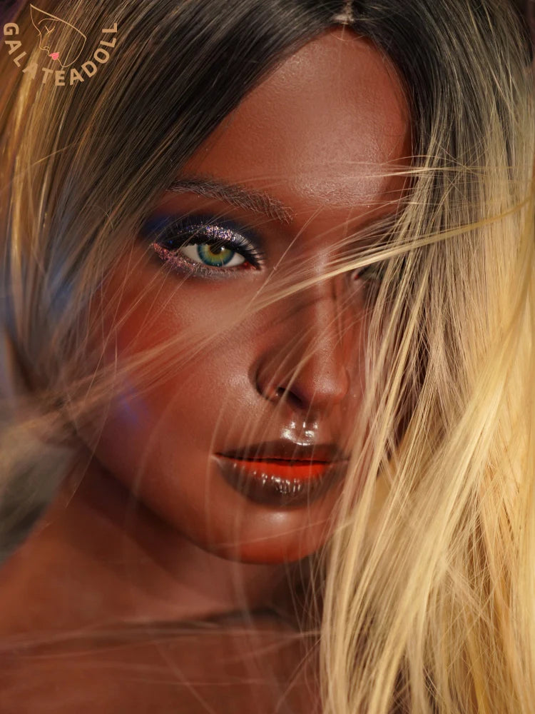 She has a black girl's exclusive skin color as smooth as chocolate lava, reflecting a subtle red-brown luster under the light. The nose bridge is as straight as a sculpture, the thick lips are lazy, and the cold contrast with the golden straight hair melts "wildness" and "nobleness" into a suffocating visual impact. Every time you touch her warm skin, you can feel the unique vitality of black pearls jumping at your fingertips, as if touching the untamed primitive desire.